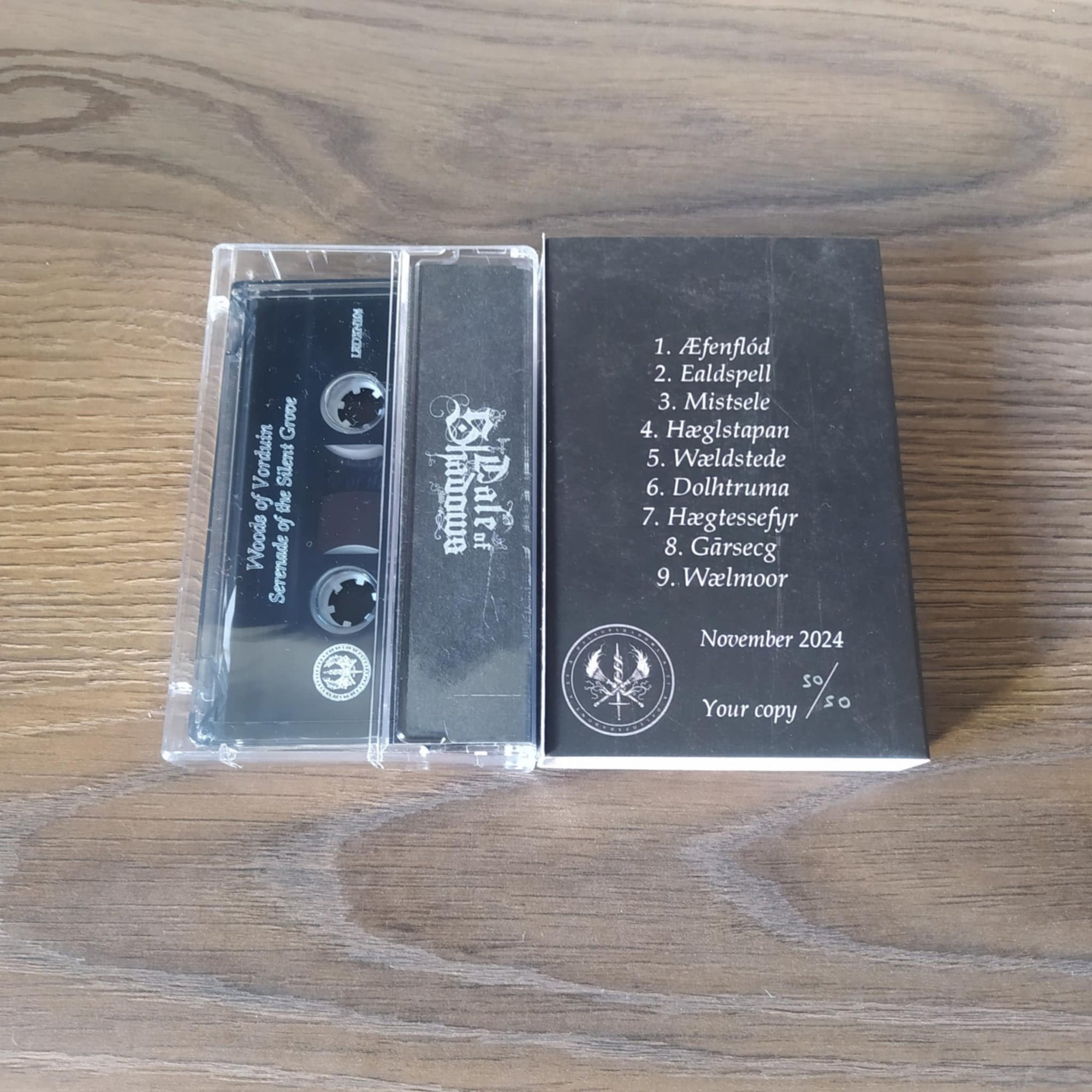 50 handnumbered copies, pro dubbed cassette, two sided 3 panel J-card on heavyweight paper, with slipcase cover